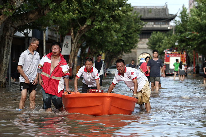 8月11日,浙江临海,救灾人员用小船运送救灾物资。