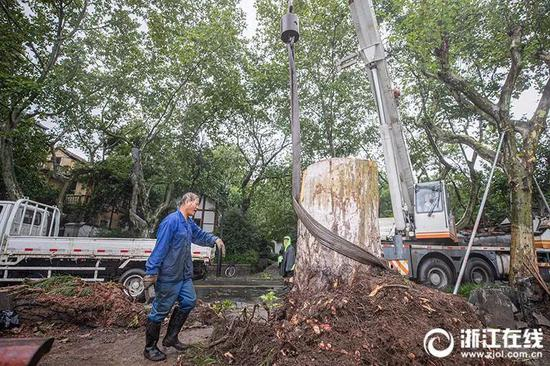 受台风“利奇马”影响,杭州西湖北山街54号附近,一株树龄60年左右的悬铃木被掀倒。