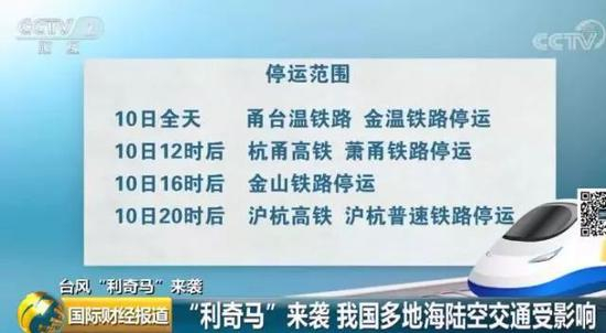 受台风“利奇马”影响,多处交通中断。从8月9日起,浙江沿海多趟列车停运,部分高速口关闭,大量的进出港航班被取消。同时,全国多地的铁路、公路和航空也受到波及。