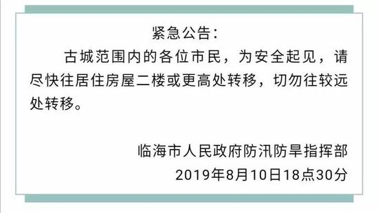 晚上21时49分,临海市防汛抗旱指挥部再次发布消息称,洪水已进入平潮期,水位正在逐渐下降。广大市民如遇困难时,可拨打110救援,也可拨打以下电话:85389937、17706599975。