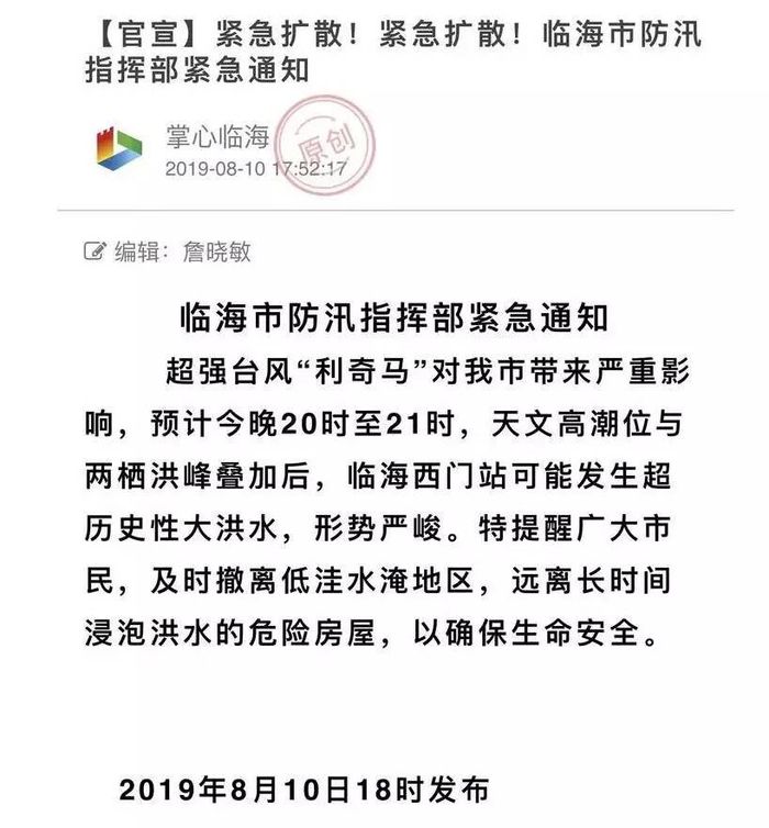 当晚18时,浙江临海市防汛指挥部发布紧急通知,预计10日晚20时至21时,天文高潮位与两栖洪峰叠加后,临海西门站可能发生超历史性大洪水。提醒市民注意防范!