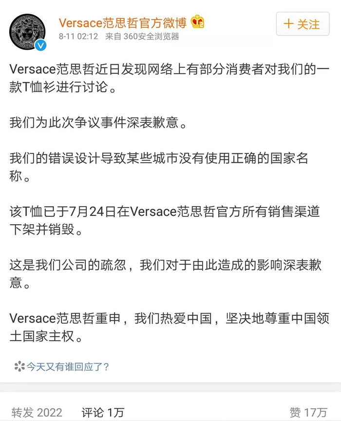 Versace范思哲重申,我们热爱中国,坚决地尊重中国领土国家主权。”