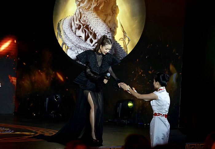 粉丝代表穿着龙文T恤上台传递“龙牌”。