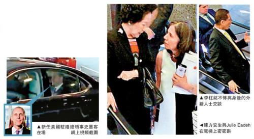 有网友在网站上传的一段6日在交易广场停车处拍摄的视频,当中包括李柱铭、Julie Eadeh在内的一行人进入2部车,车牌分别为SZ14**、NTC0**。据报道,这两辆车均隶属美国驻港澳总领事馆。这段视频清晰显示,史墨客当时就坐在车牌为SZ14**的轿车中。