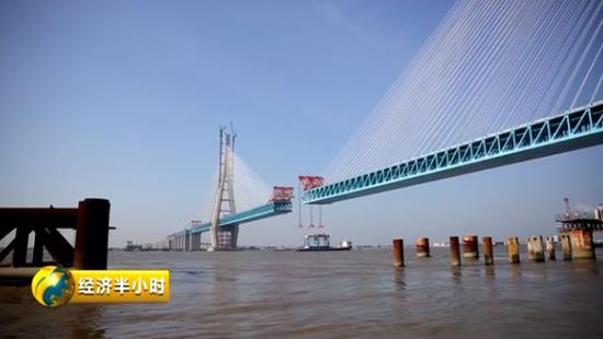 沪通长江大桥连接江苏南通和张家港,全长11072米。大桥采用主跨1092米的钢桁梁斜拉桥结构,是目前世界上跨度最大的公铁两用斜拉桥,也是世界上首座超过千米跨度的公铁两用桥,预计2020年完工。我国自主研发、全球首台1800吨架梁吊机正吊起整节段钢梁到指定位置。
