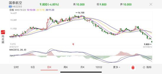 今天(8月12日),国泰航空股价大跌4.85%,市值蒸发19.67亿港元,股价报收9.8港元,创下了2018年10月29日以来最低。从七月下旬以来,国泰航空股价持续下行,18个交易日市值累计蒸发了96.77亿港元。