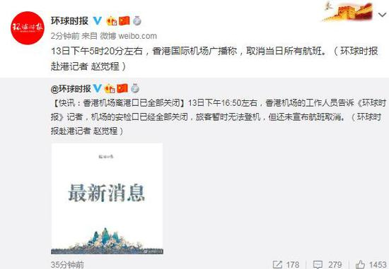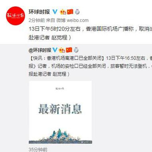 13日下午5时20分左右,香港国际机场广播称,取消当日所有航班。(环球时报赴港记者 赵觉珵)