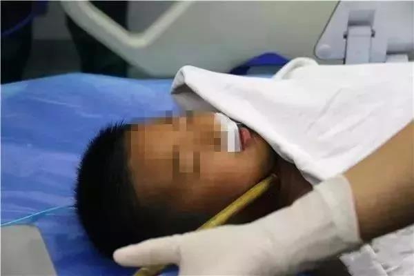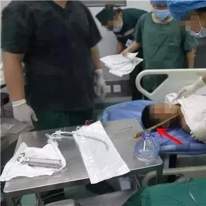 受伤孩子在接受救治,图中红色箭头所指的为插入孩子颈部的竹子