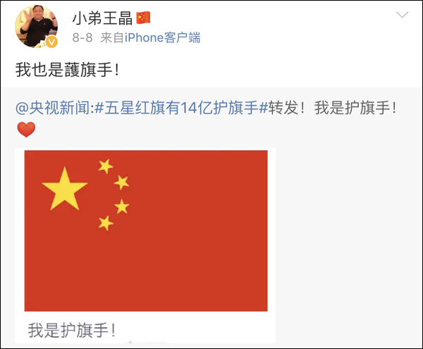 随后他还加入了央视新闻发起的“五星红旗有14亿护旗手”活动。
