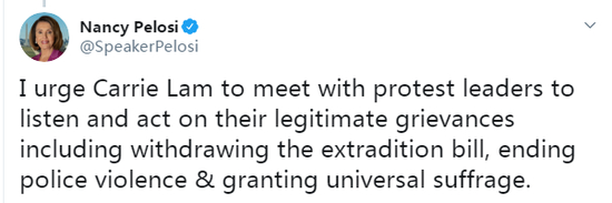 据《明报》报道,美国众议院议长佩洛西周一(12日)在推特发文,不分黑白地指责香港警方“暴力”,对香港示威者被称为“暴徒”表示不满。