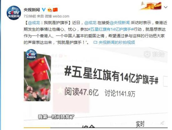 [@成龙:我就是护旗手]近日,@成龙 在接受@央视新闻 采访时表示,香港近期发生的事情让他痛心、忧心,参加#五星红旗有14亿护旗手#行动,就是想表达作为一个香港人、一个中国人基本的爱国之情,希望通过参与这样的行动把大家的声音表达出来,“我就是护旗手!”。