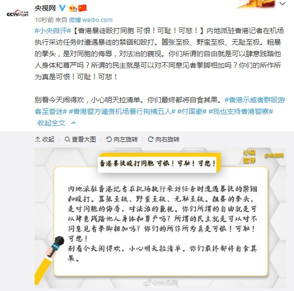 内地派驻香港记者在机场执行采访任务时遭遇暴徒的禁锢和殴打。嚣张至极、野蛮至极、无耻至极。粗暴的拳头,是对同胞的侮辱,对法治的藐视。你们所谓的自由就是可以肆意践踏他人身体和尊严吗?所谓的民主就是可以对不同意见者拳脚相加吗?你们的所作所为真是可恨!可耻!可悲!