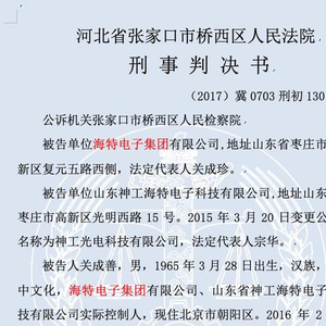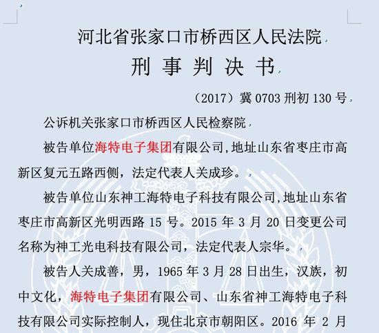 2018年12月12日,河北张家口桥西区法院作出一审判决,因犯单位行贿罪,海特电子集团、山东神工海特电子科技公司,分别被处罚金80万,实际控制人关成善获刑1年半、缓刑2年。