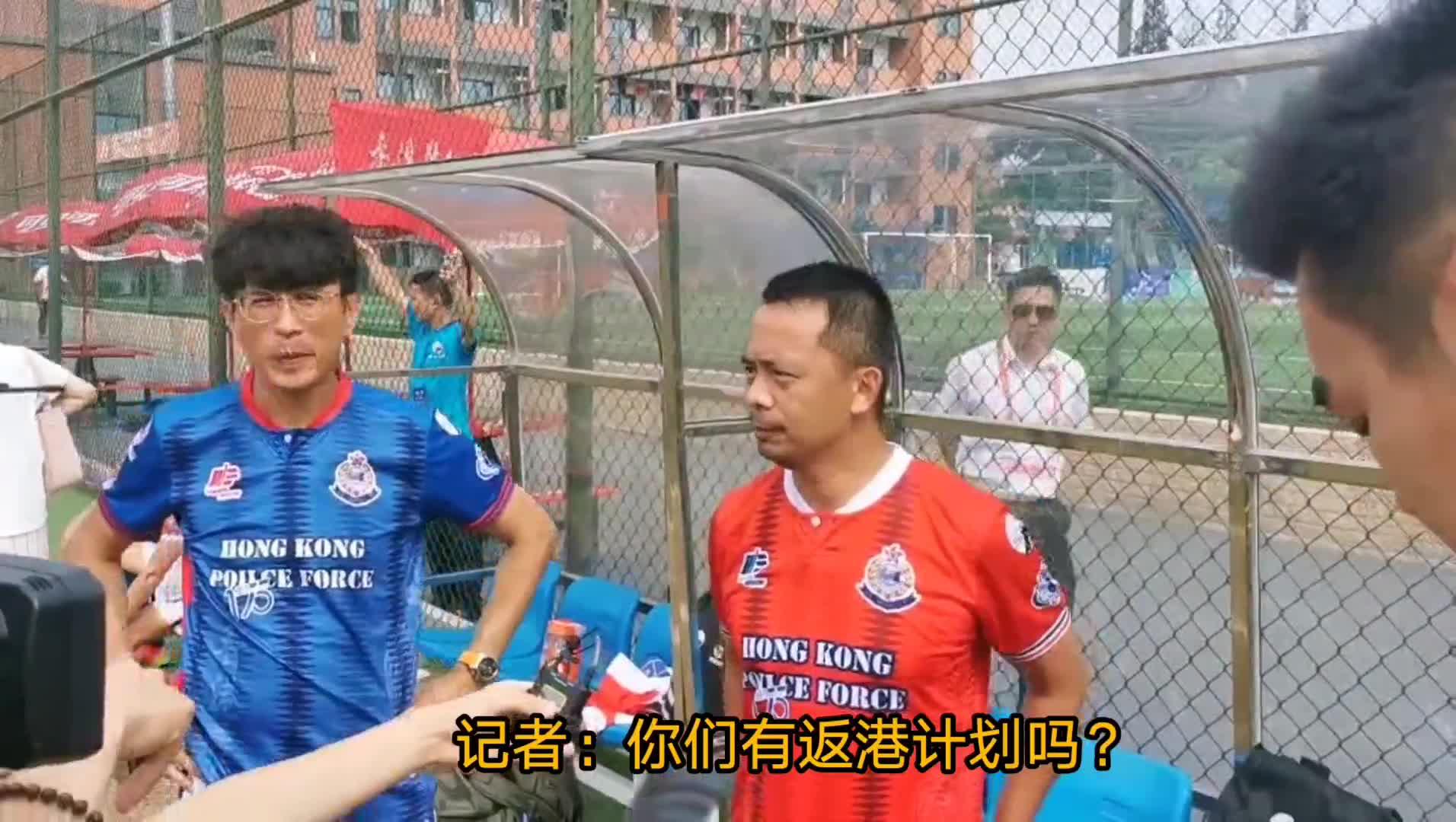今天上午,温江足球训练基地,44岁的香港冲锋队警察球员袁志成面对林立的摄像镜头,双手竖起大拇指,重复着这几句话。