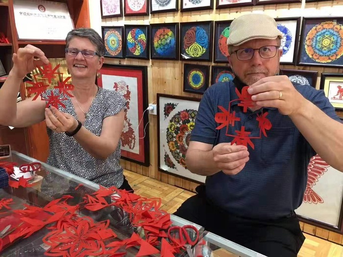 温涛的剪纸铺子里,正在学习剪纸的外国游客。受访者供图