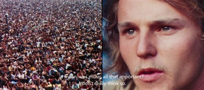 在纪录片《伍德斯托克音乐节1969》的镜头里,一个金发男孩说:“好像每一个来的人都在寻找某种答案。当然,我认为这里没有。为什么60000,70000甚至更多的人都来到了这?音乐真这么重要吗?我不这么想。人们不知道该如何生活,人们不知道该怎么做,但他们觉得这里或许可以给出一个答案。人们只是非常迷茫而已。”