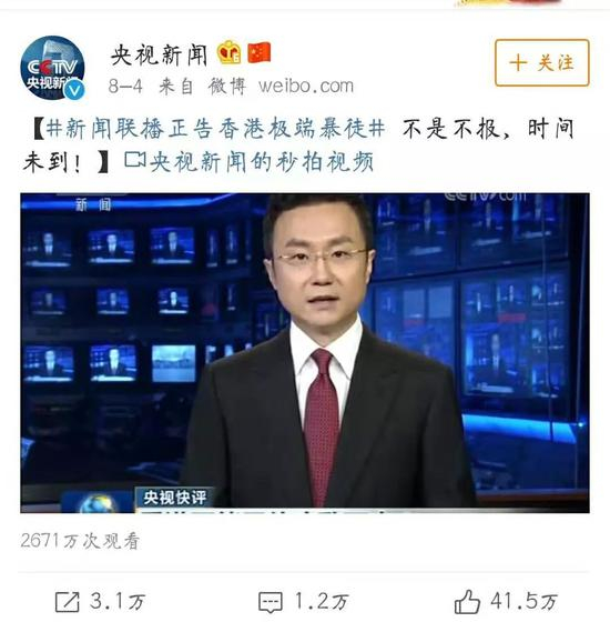 8月12日,《新闻联播》在快评《依法严惩恐怖暴行 坚决恢复香港秩序》中提到: