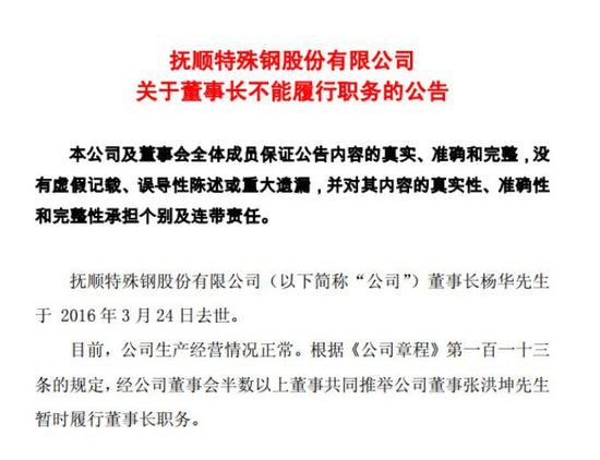 在2016年3月杨华去世后,抚顺特钢公司董事长职务由张洪坤接任,当时抚顺特钢发布的公告显示:经公司董事会半数以上董事共同推举公司董事张洪坤先生暂时履行董事长职务。