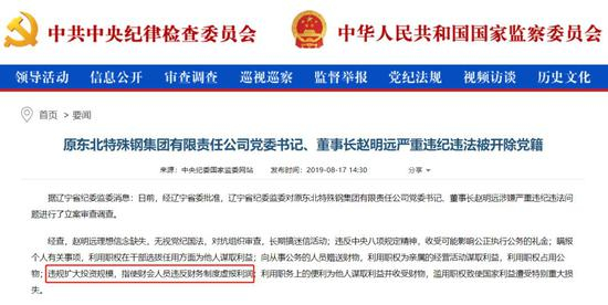 8月17日下午,辽宁省纪委监委发布消息,原东北特殊钢集团有限责任公司党委书记、董事长赵明远被开除党籍并取消其退休待遇。