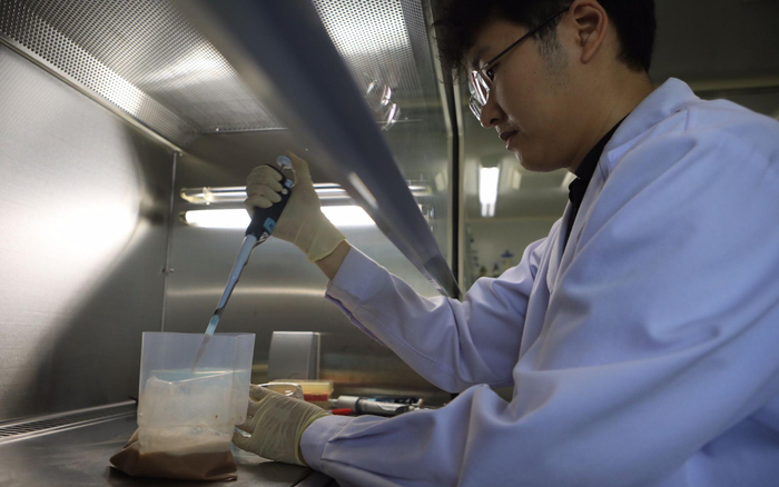 工作人员在超净工作台上操作。