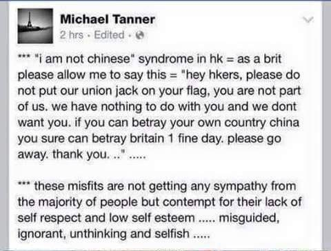 “你好香港人,请不要滥用我们的国旗标志,你们不是我们的一份子,我们跟你们没有任何关系,也不想有。