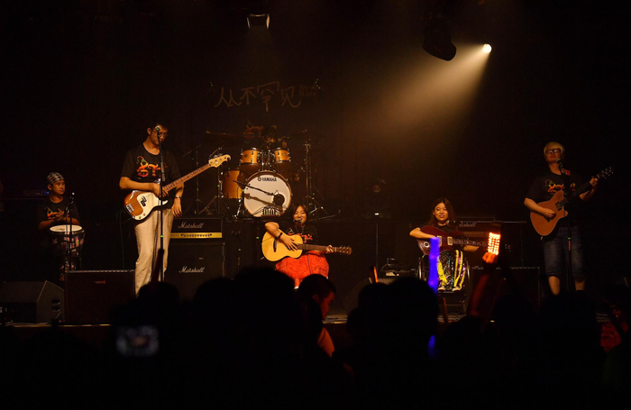 坐在轮椅上的主唱崔莹,身体随着节奏左右摇摆。怀里抱着的吉他和她娇小的身躯形成鲜明对比,样子像是一个小孩抱着与自己个头极不相称的大玩具。她的鞋子白得耀眼,连鞋底也没有一点污渍,随着音乐节拍一踮一踮。
