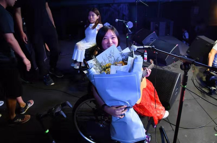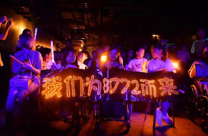 台下的观众也特别。最前排的13个人中,7个姑娘和1个小伙子都坐着轮椅,一个白化病姑娘的睫毛扑闪扑闪,挥着手里的荧光棒。