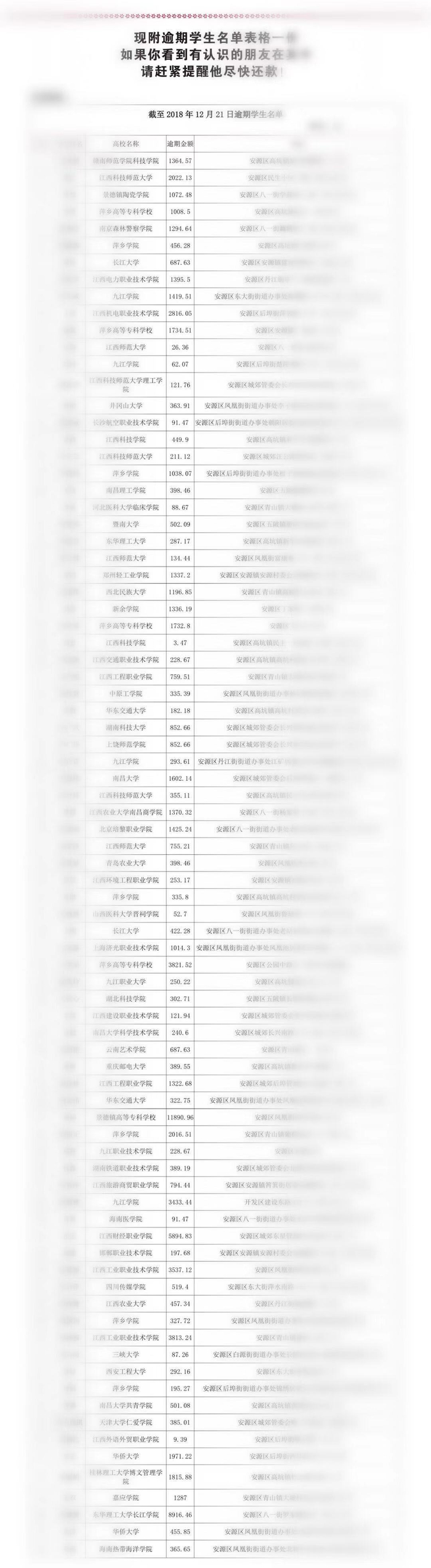 根据该行公布的名单,截至2018年12月21日贷款逾期学生共计141人,其中安源区82人,湘东区59人。值得注意的是,该行还公布了学生的姓名、高校、逾期金额、住址信息。名单中大部分是江西本地高校的学生,例如江西师范大学、南昌大学等,也有少部分如广东、湖北、湖南、河北、山东、四川等外地高校的学生。