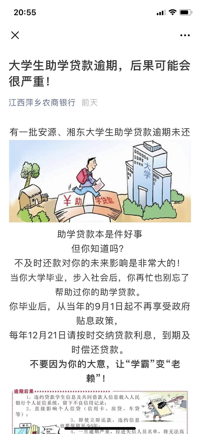 8月15日,江西萍乡农商银行在其微信公众号发布文章,称该行有一批安源、湘东大学生助学贷款逾期未还,同时公布了逾期学生名单,并呼吁“如果你看到有认识的朋友在其中,请赶紧提醒他尽快还款!”