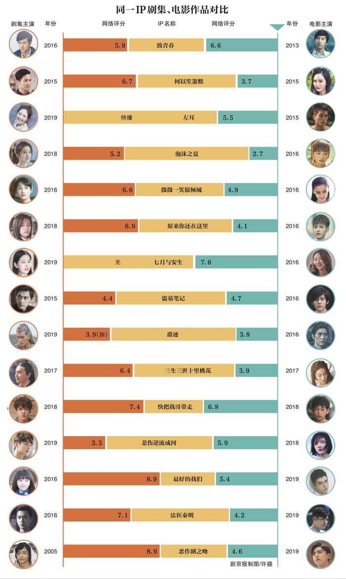 新京报统计了近年来既改编成电影,同时也改编成剧集的多个IP数据,发现文学作品依然是IP影视化占比高的品类;同一个“热门”IP通常会先被改编成电影再改编成剧集;不论影剧,先拍的作品比后拍的口碑普遍要好;而同IP改编又在同一年上映/播出的影视剧,剧集的口碑高于电影。