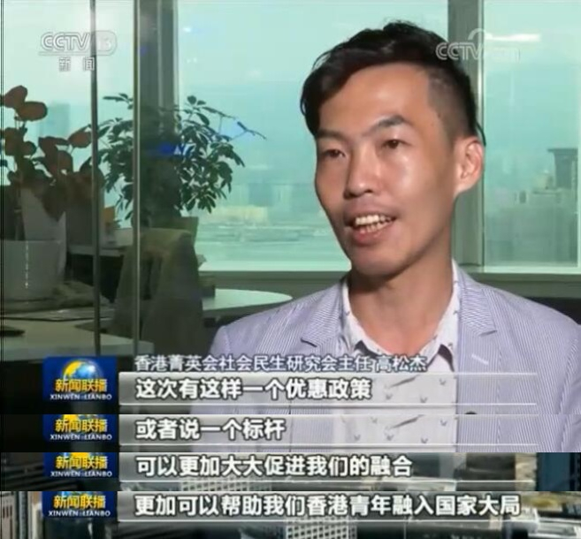 香港菁英会社会民生研究会主任 高松杰:这次有这样一个优惠政策,或者说一个标杆,可以更加大大促进我们的融合,更加可以帮助我们香港青年融入国家大局。
