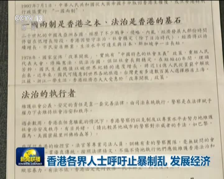 《新闻联播》香港各界人士呼吁止暴制乱 发展经济