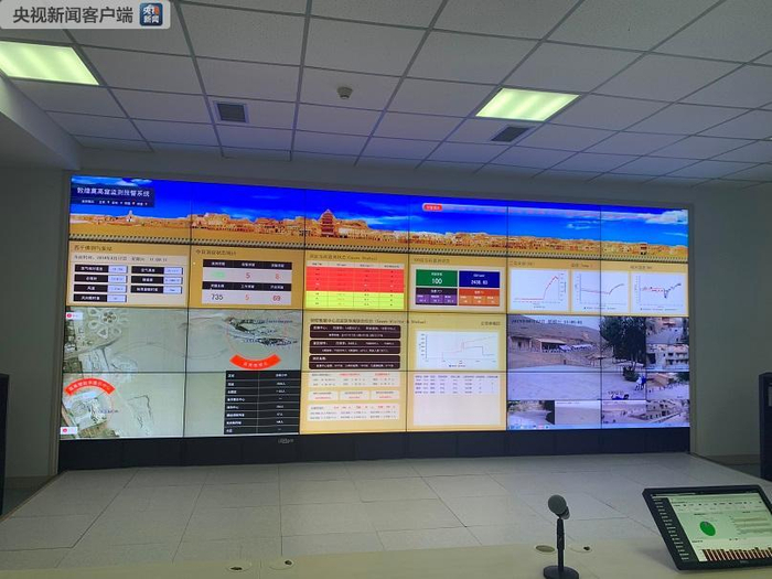 △为保障洞窟壁画和彩塑保存环境稳定,敦煌研究院采用现代物联网技术构建了莫高窟监测预警体系。这是处于莫高窟第72窟前的环境监测设备,可以进行气象、空气质量和颗粒物监测。这些数据会实时显示在敦煌研究院的监测中心大屏。(央视记者郭晗光拍摄)