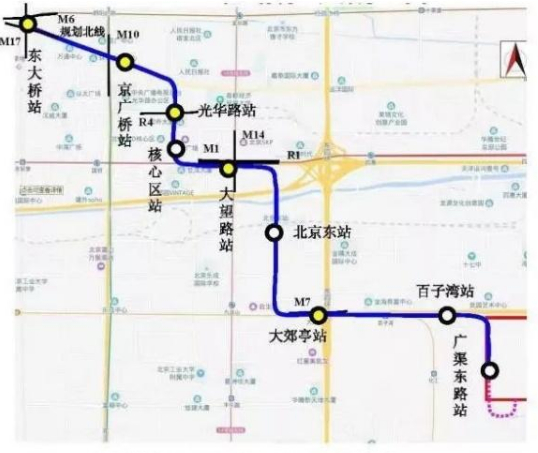 近期线路起点为东大桥站,沿途设京广桥站、光华路站、核心区站、大望路站、北京东站、大郊亭站、广渠路站,终点至广渠东路站。