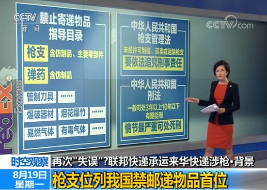 我国对枪支一直有着非常严格的管控,在国家邮政局《禁止寄递物品指导目录》里,十余类禁止邮递物品中,“枪支(含仿制品、主要零部件)弹药”是排在首位的。根据《中华人民共和国枪支管理法》,未经许可制造、买卖或者运输枪支的,要依法追究刑事责任。在我国邮寄武器已经属于刑事案件,根据我国刑法,一般可处3年以上10年以下有期徒刑,情节最严重的可处死刑。联邦快递在国内承运时如明知故犯,后果无疑很严重。