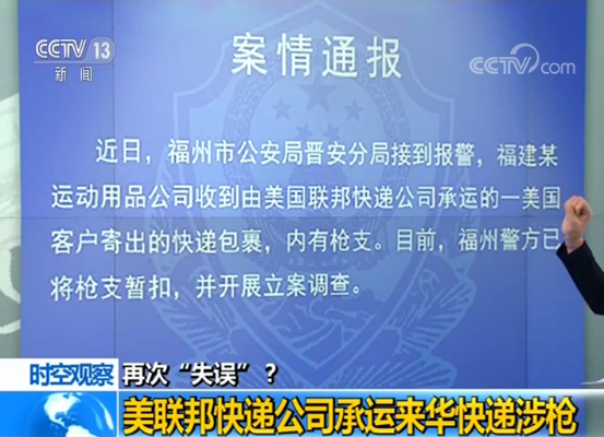 8月18日,福建省福州市公安局晋安分局通报一起案件:该局近期接到报警,福建某运动用品公司收到由美国联邦快递公司承运的一美国客户寄出的快递包裹,内有枪支。目前,福州警方已将枪支暂扣,并开展立案调查。