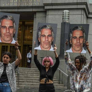 上周,抗议者举着印有杰弗瑞·爱泼斯坦肖像的标语在纽约联邦法院外示威。