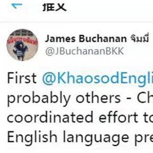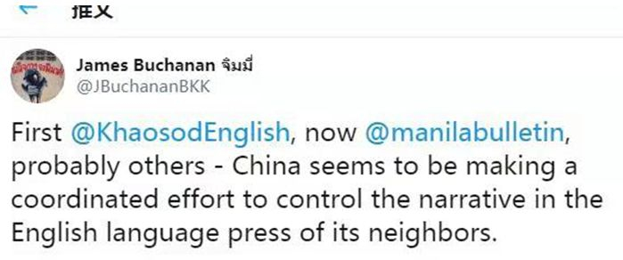 推特上一个名为James Buchanan的人说,“中国正在竭力控制周边国家英文世界的说辞”。