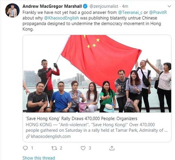 苏格兰记者兼作家Andrew MacGregorMarshall在推特上质问《考苏得英文报》为何公然发表中国媒体意图破坏香港民主运动的“不实”报道。