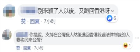 “别来杀了人以后,又跑回香港呀”,“支持在台湾杀人然后逃回香港躲避法律制裁的人要移民来台湾吗?”