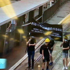8月18日下午,香港,大雨。有部分激进示威者面戴口罩,打着美国国旗在铜锣湾游行示威。