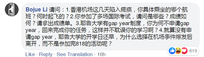 有网友质疑他在机场瘫痪那两天是如何离港的,以及怎样取得耶鲁大学全额奖学金的。而罗一直没有任何回复。