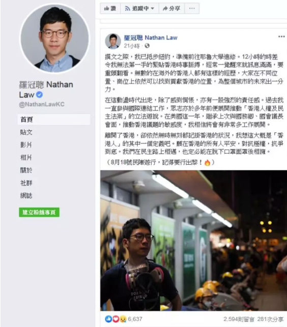 8月18日,乱港头目之一罗冠聪身在美国,在多家社交网站上疯狂发文煽动鼓噪、关注遥控香港示威活动。
