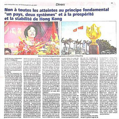 2019年8月20日,驻马达加斯加大使杨小茸在马发行量最大的报纸之一《午报》发表署名文章《“一国两制”底线不容触碰,香港繁荣稳定不容损害》。全文如下:
