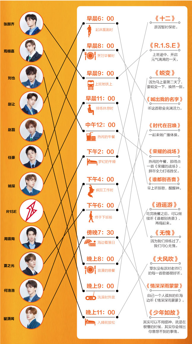 认真唱跳的十一位少年在一天的十二小时里会听哪些歌?我们分了每个时间段和场景,请他们每人推荐一首爱听的歌并说出理由,以下是他们的答案。