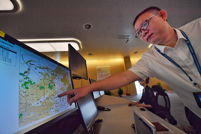 工作人员在进行气象服务。