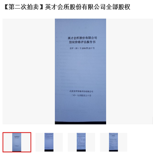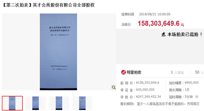 约二十天前,7月29日至7月30日,北京市第二中级人民法院拍卖过一次英才会所100%股权,当时起拍价约1.97亿元。