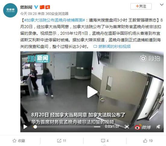 原标题:加拿大法院公布孟晚舟被捕画面:遭海关搜查盘问3小时 王毅曾强硬表态