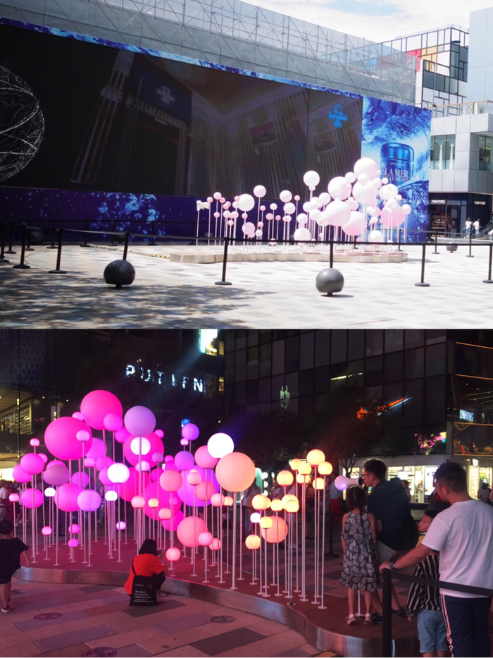 《泡泡与魔法师》长8米、宽4米、高3.5米,主体由7种尺寸的不透明聚乙烯气泡球组成。装置从音频传感器收集到数据,包括每次吹气时的振动、音量和频率,而后转换成动态视觉效果。泡泡的颜色由算法随机生成,实时播放,每次吹气都会有全新的观看体验。正是因为互动性强,所以一到晚上来这里排队吹泡泡的人就络绎不绝。