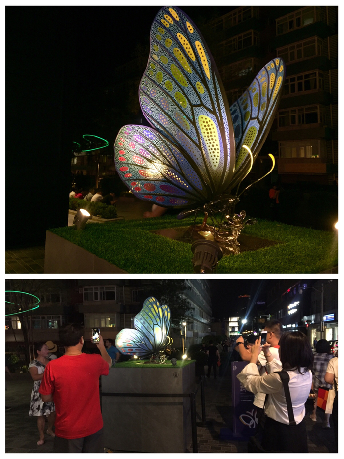《幻蝶》用仿生形态的镂空钢板展现了一只姿态轻盈曼妙的蝴蝶,这个灯光艺术作品虽然不能互动,但因为造型美观、色彩迷人,吸引了很多游客拍照。